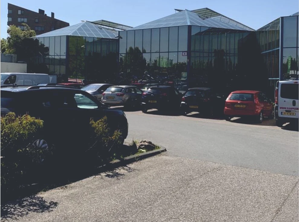 Het gebouw van Tuincentrum Osdorp aan de Pieter Calandlaan in Amsterdam Nieuw-West, met de glazen kasconstructies en het parkeerterrein voor de ingang.